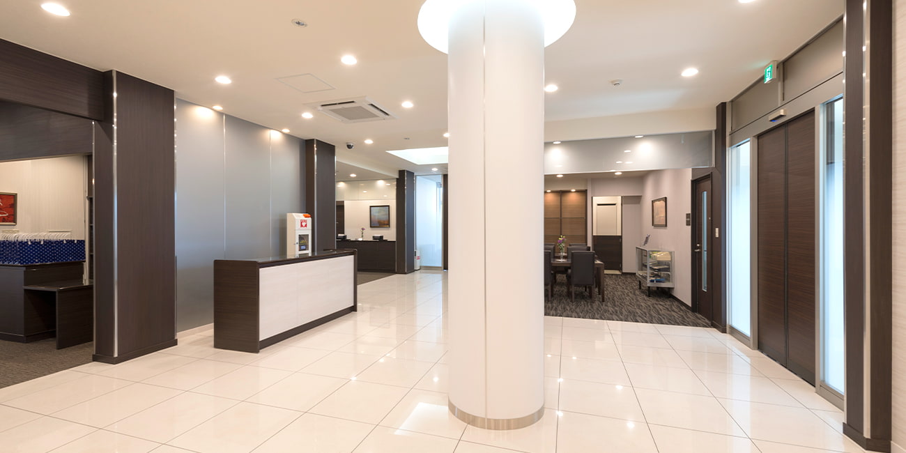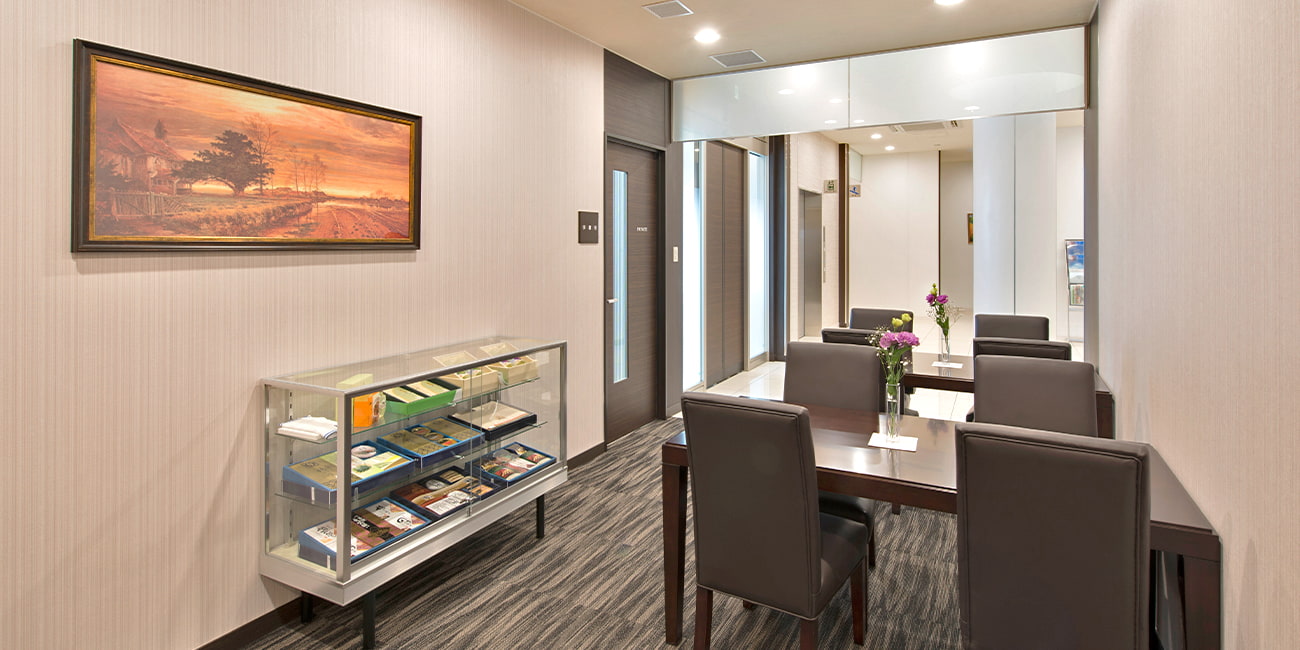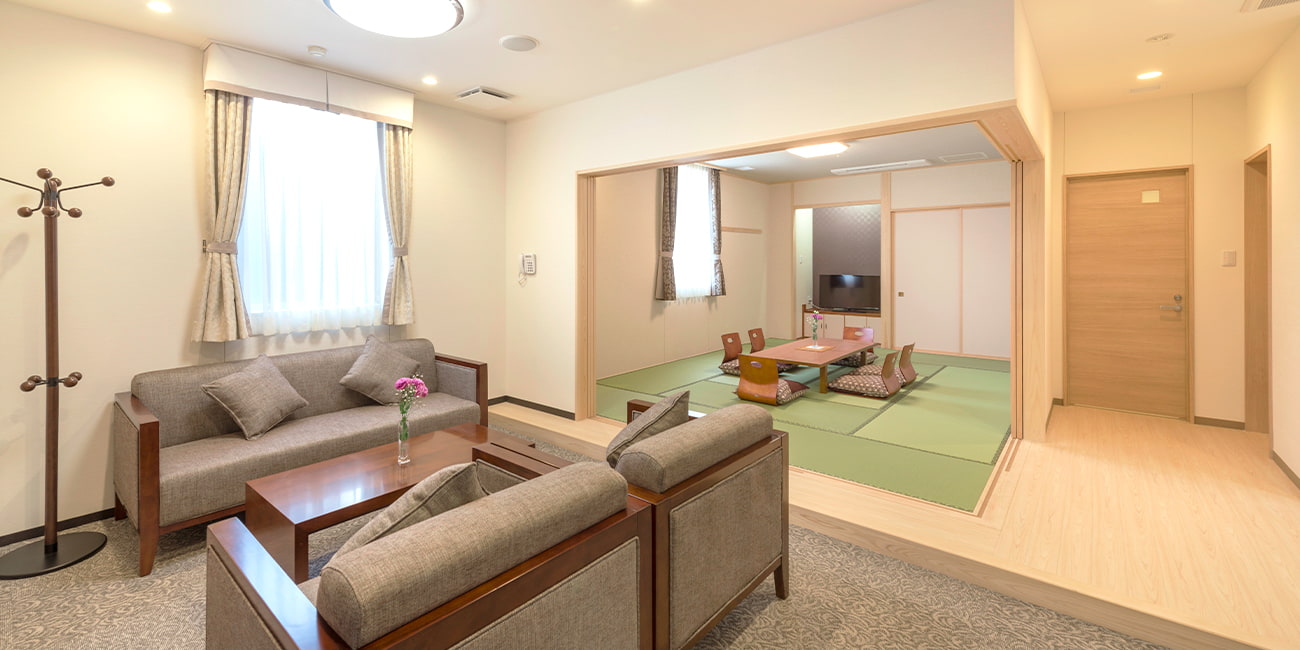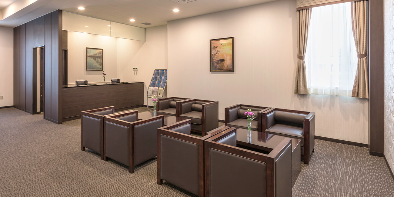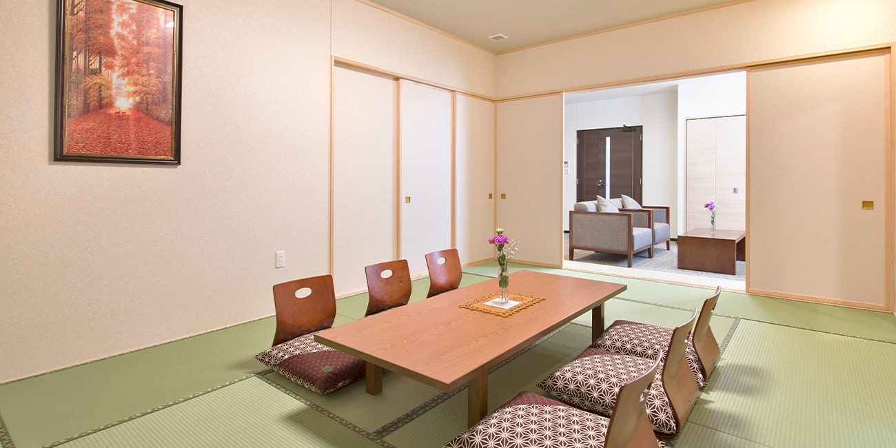 式場は1階と2階に分かれており、2組のお葬儀ができる環境を整備しております。1階の式場は、入り口から入られたらすぐ受付ができますので、スムーズに移動できる構造です。お泊まりも出来る控室については、和洋室を完備しております。