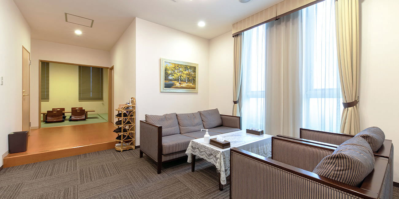 当館のおすすめは、ゆったりと過ごしやすい広さの親族控室です。バスルーム、トイレ、キッチンと宿泊設備も整っているため、自宅に居るような感覚で宿泊していただけます。お通夜が終わった後の、故人様との時間をゆっくりとお過ごしできます。