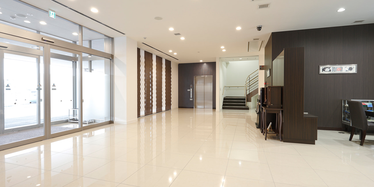 フロア構成は、1階は霊安室、2階3階は各フロア貸切りの式場となっております。他会葬者様に気を遣うことなくお葬式を行えるのが特徴です。親族控室は宿泊設備を完備しておりますので、遠方からのご会葬者様も安心してご利用できます。