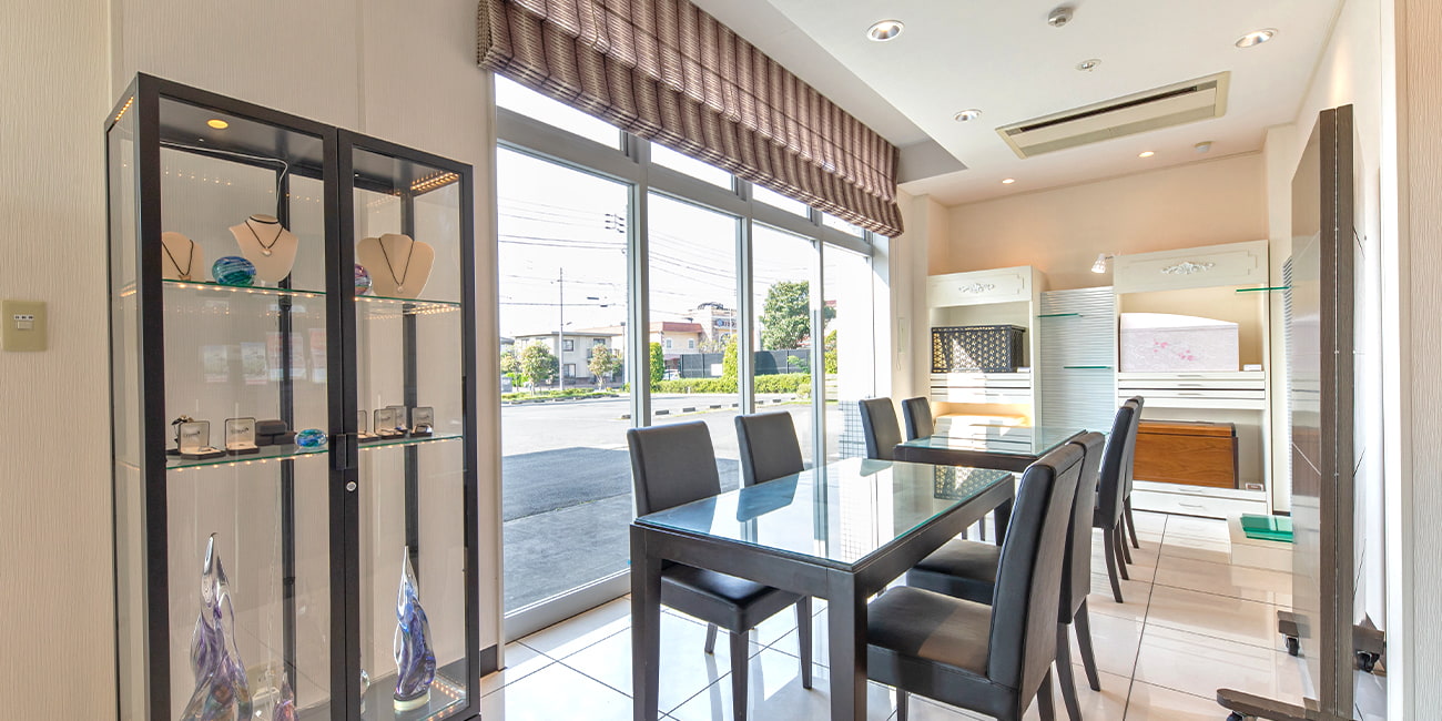 1階が家族葬向けの式場とゆとりを持ったロビー、2階が一般葬向けの式場となっております。お客様のご要望をより考慮しやすい構成となっておりますので、ご希望をお聞かせください。また、ロビーにはお客様とお打合せを行えるスペースがございます。棺や、商品展示も行っておりますので、分かりやすい説明が行えます。