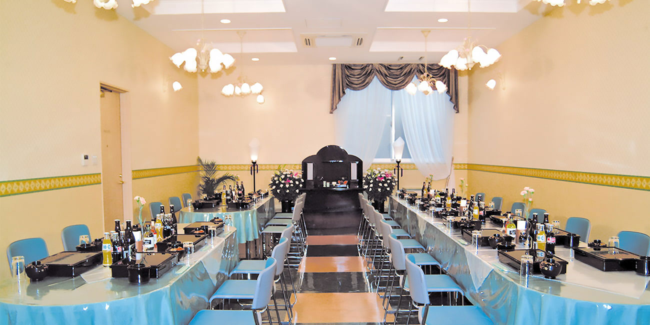 式場は全面ガラス張りのあたたかな雰囲気が特徴の1式場のみご用意しております。1式場のため、1組様ずつご対応させていただきますので、ご家族様のみの貸切状態でのお葬式が可能です。また、館内はワンフロアかつバリアフリー対応となっております。お身体の不自由な方、ご高齢の方でも安心してお葬式を行えます。