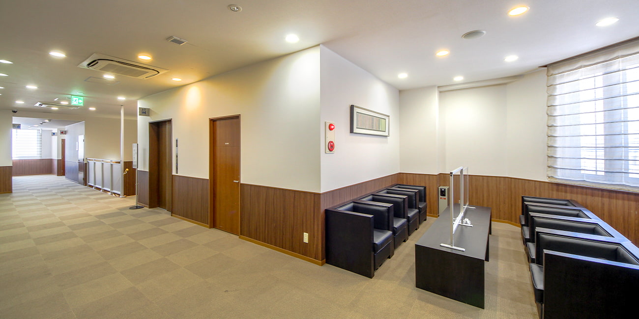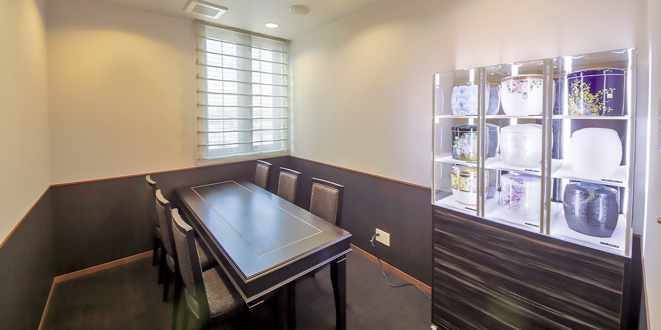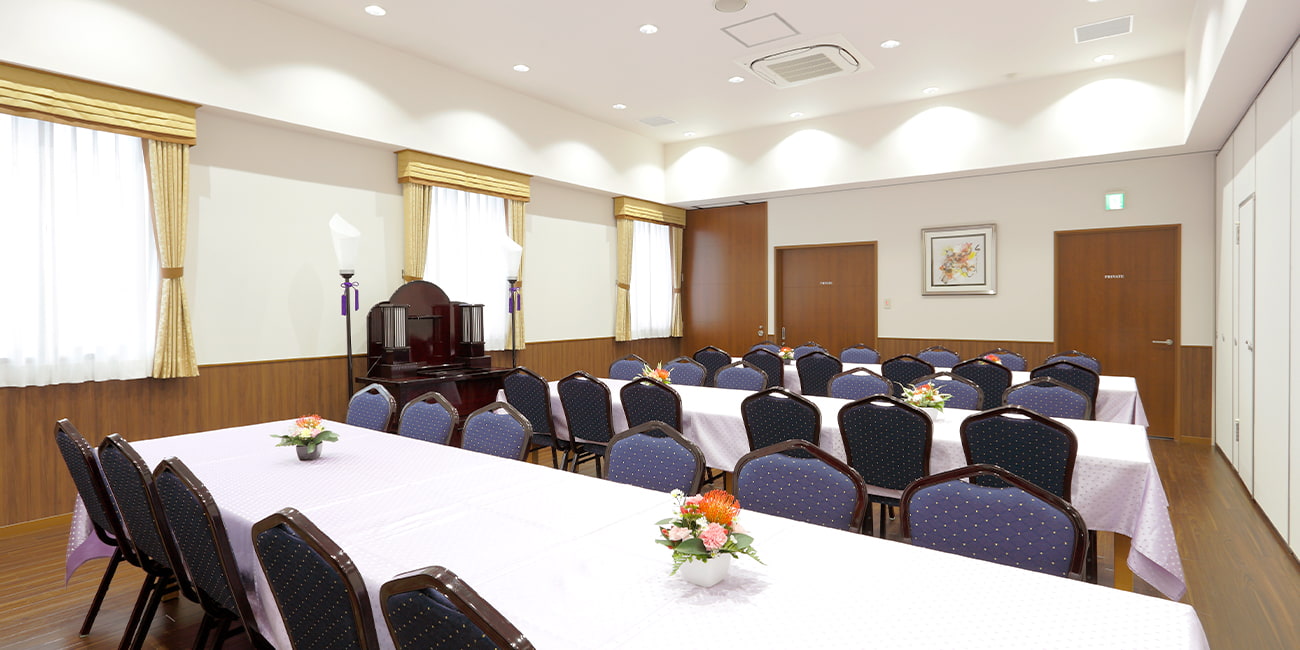式場は1階の20~30名規模の家族葬向け式場と、2階の70~80名規模の式場がございます。お客様のご希望に合わせて対応できますので、式場の広さなどをご心配する必要はございません。控室は式場と繋がっておりますので、故人様との最期の時間をゆったりと過ごすことが可能です。