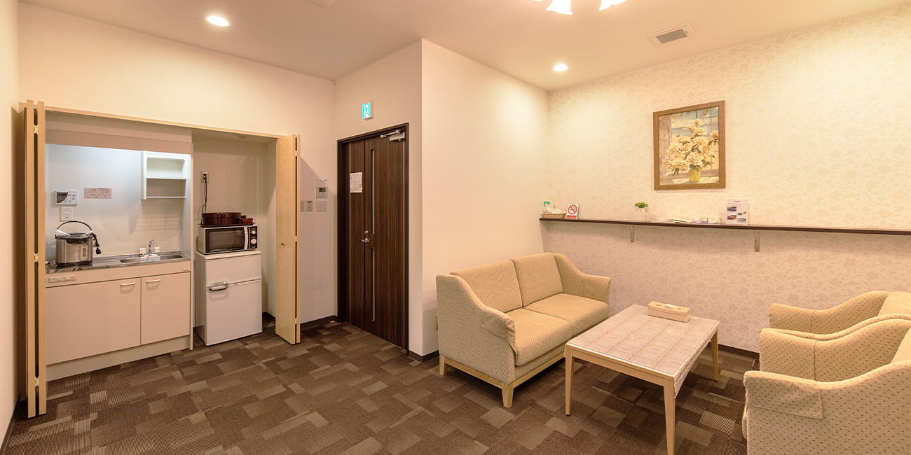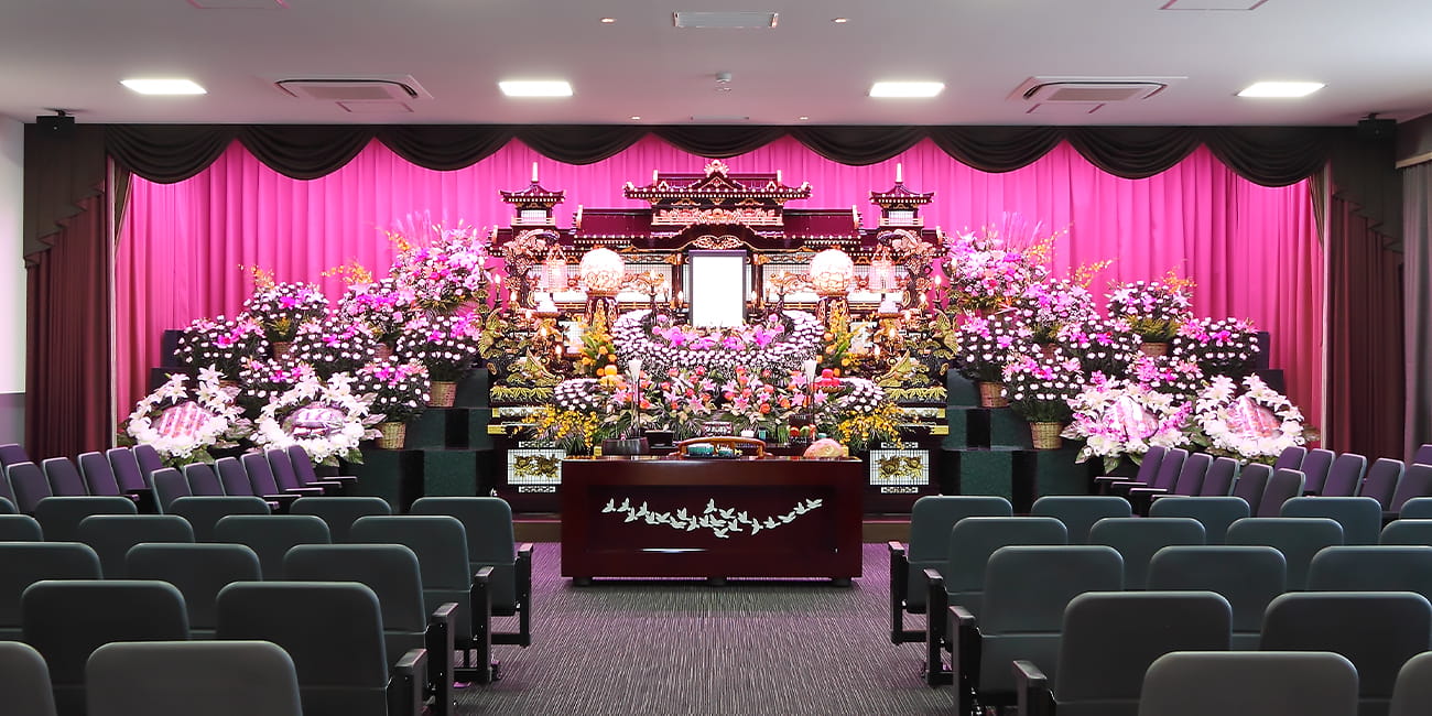 狭山葬斎センターは、1階にロビー、2階、3階にそれぞれ別の形の式場を完備しております会館です。式場は最大で80名ほど収容可能です。家族葬を行う際は、式場を半分に区切り、ご会葬者様の人数に合わせさせていただきます。