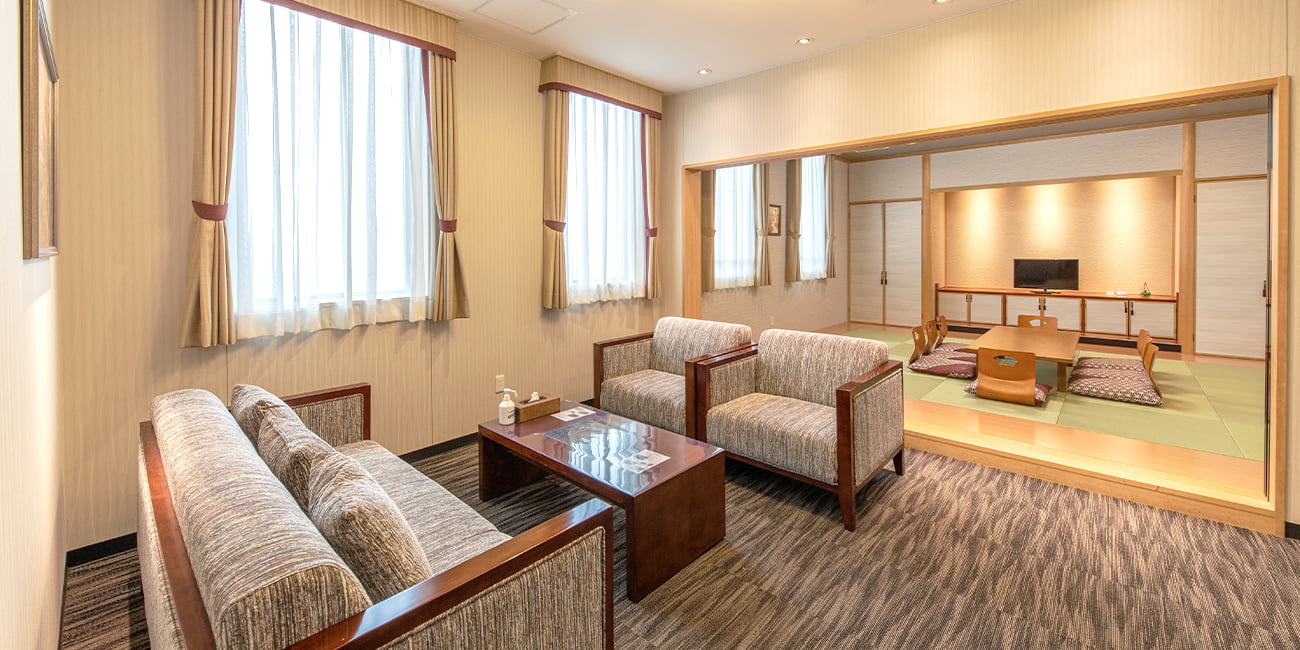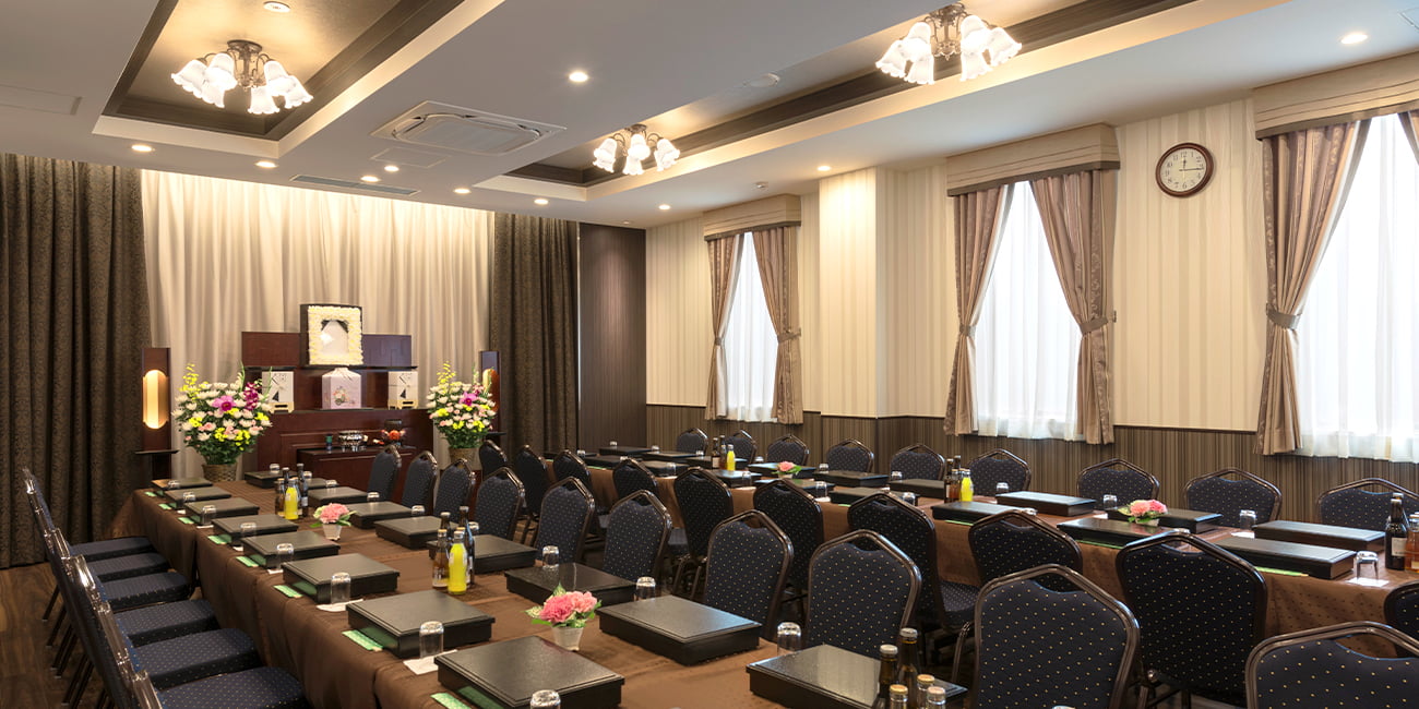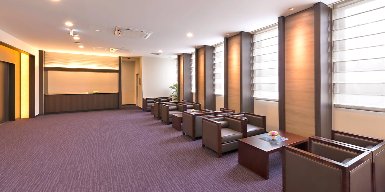 フロア構成は、1階がエントランス、2階が一般葬用式場、3階が家族葬ホールとなっております。家族葬ホールは式場と親族の控室が一つになっており、故人様との最期の時間をゆったり過ごすことができます。