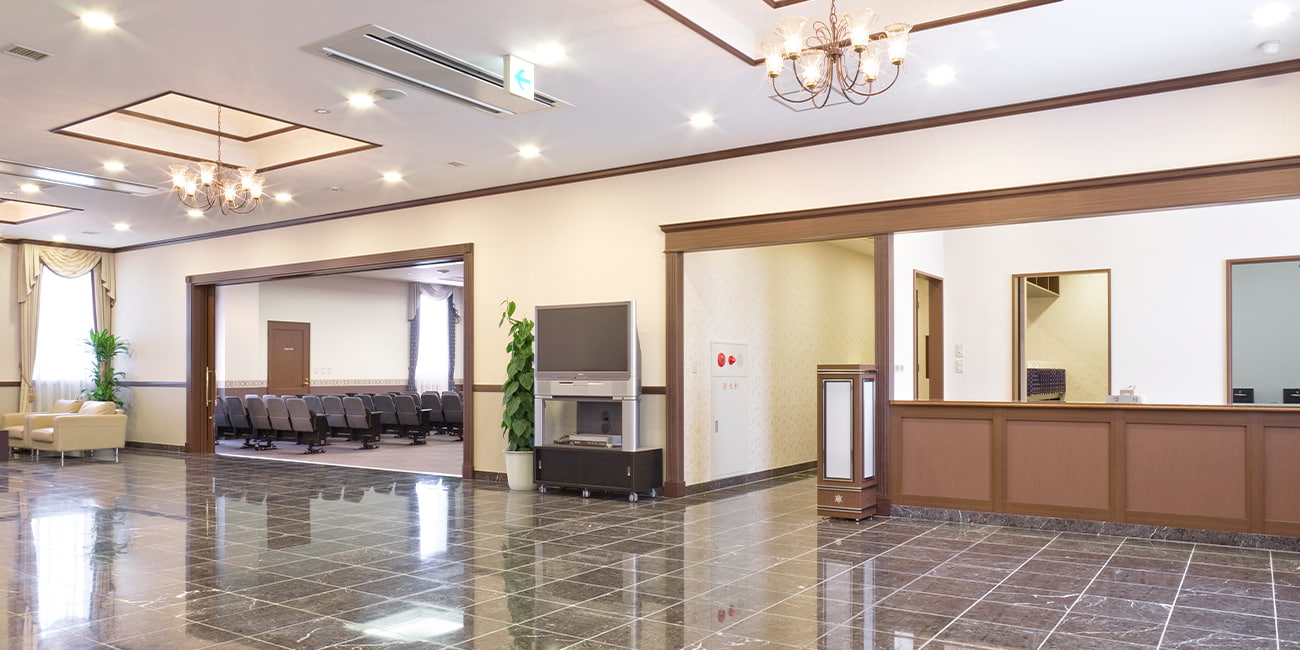 式場施設としては、1階には30名規模の家族葬専用式場、2階と3階は30名以上を収容できる式場がございます。また、宿泊の施設も充実しており、全フロアに浴室を完備した控室をご用意しております。遠方よりお越しの方にもゆっくりとお過ごし頂く事が出来ます。24時間対応の霊安室も完備しておりますので、万が一の時にも安心してご利用頂ける施設となっております。