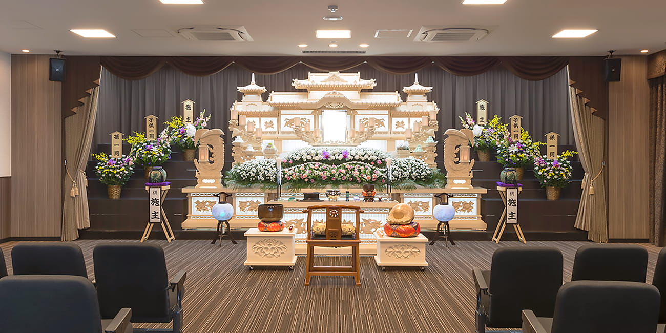 式場は2、3階に分かれており、1日に2件のお葬儀に対応できますが、フロアを区切っていることで、他のお客様へ気を遣うことなくお見送りができます。また、家族葬から一般葬まで、宗旨宗派問わず対応できますので、何なりとお申し付けください。厚生労働省認定「一級葬祭ディレクター」資格を有するスタッフも在籍しておりますので、あらゆる疑問、希望にお応えいたします。
